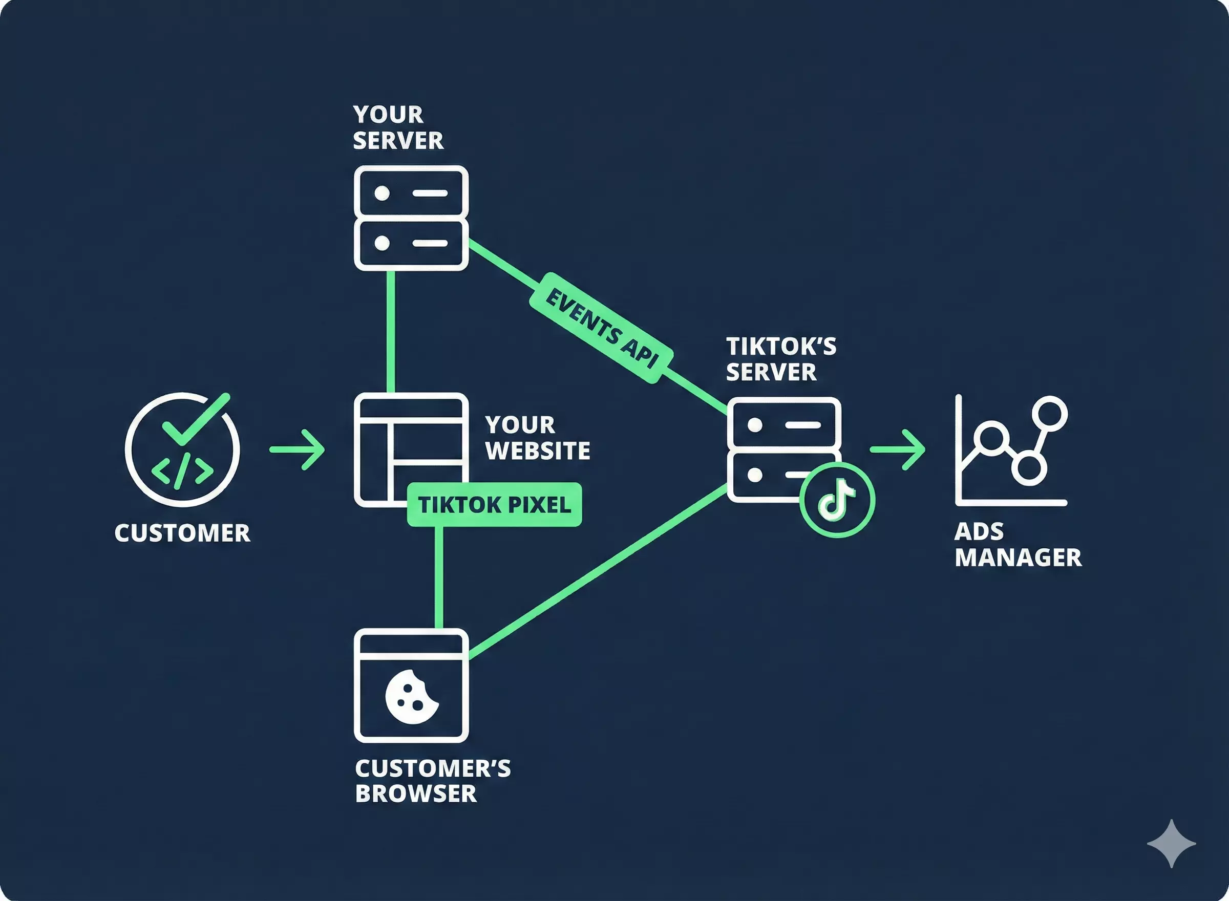 TikTok's response to these restrictions is called the Events API. The principle is the same as for Meta CAPI: instead of asking the browser (fragile and blocked) to send the data, it is your own server that sends the information securely and directly to TikTok's servers (Server-to-Server / S2S).