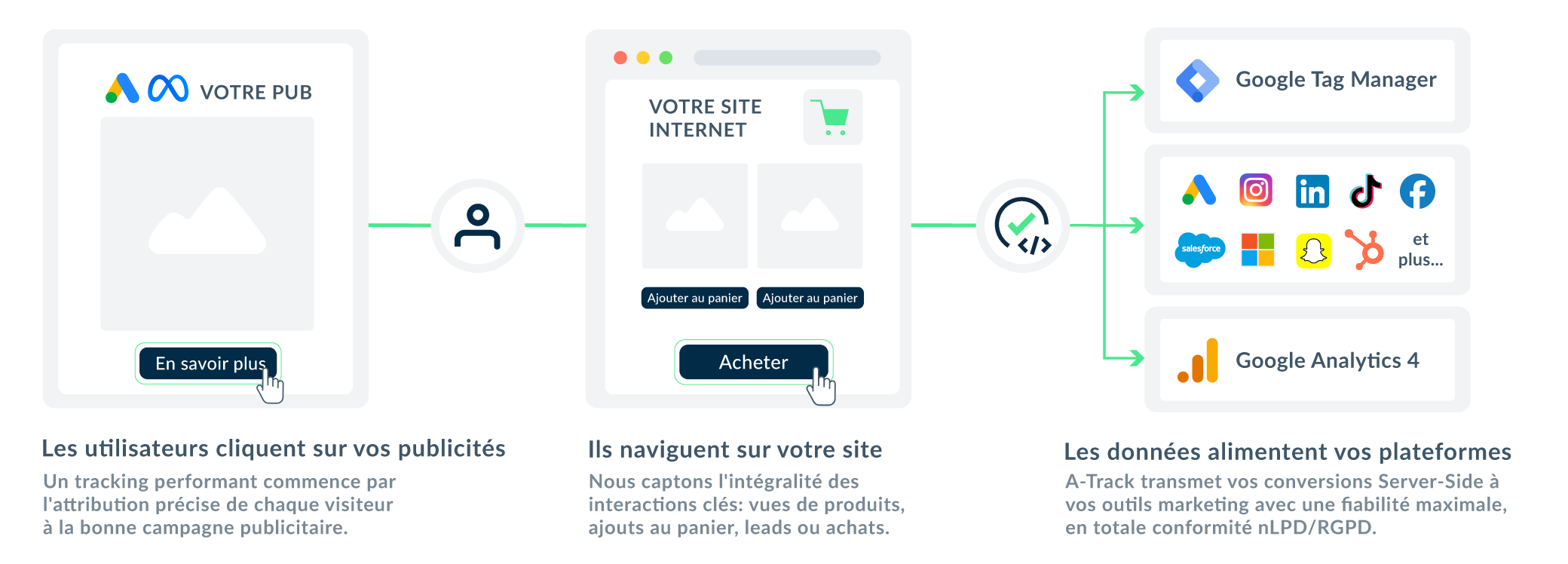 Votre serveur transmet uniquement ce qui est nécessaire aux plateformes publicitaires (API).